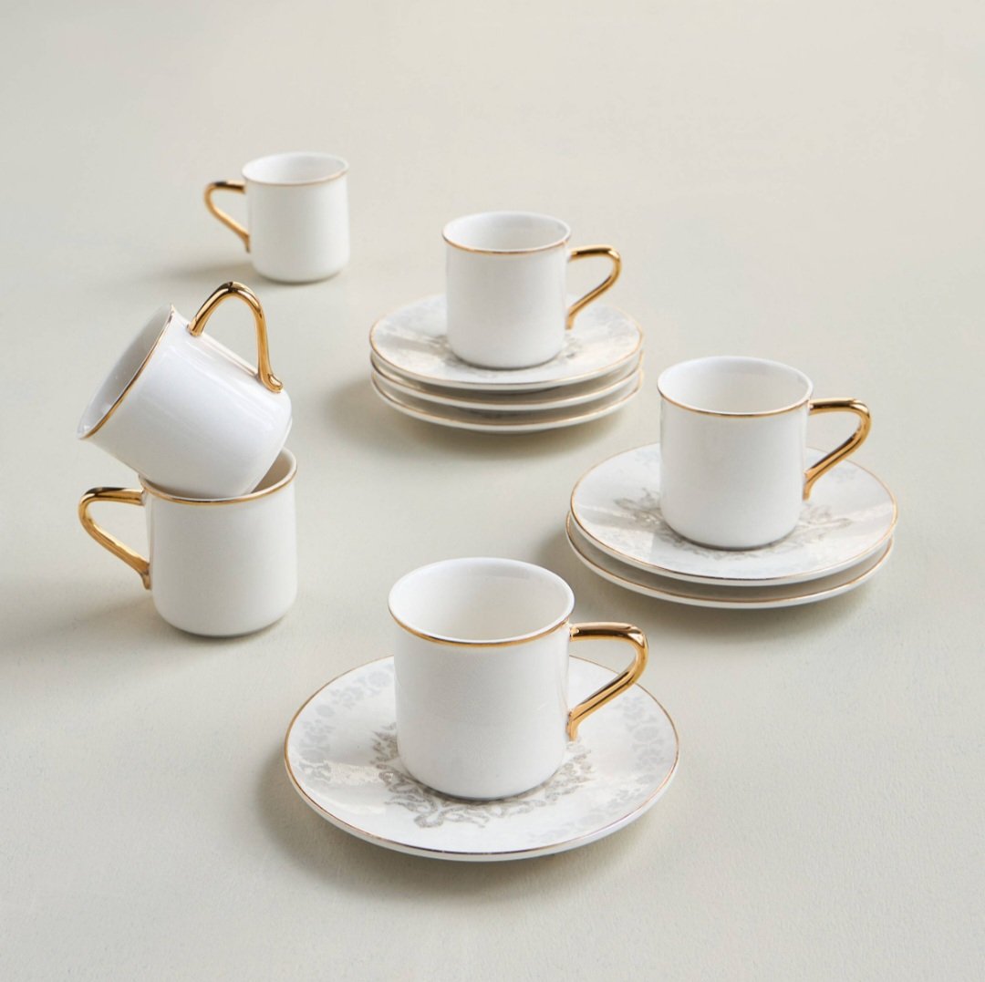 طقم شاي باللبن أبيض بدهبي بصحن مزخرف