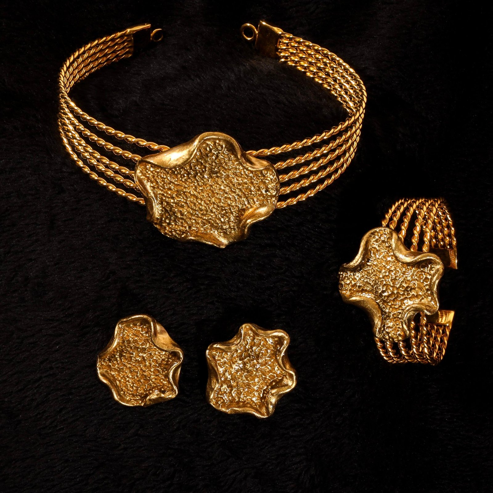 الطقم مكون من عقد وحلق واسورة ومصنوع من النحاس المطلي ذهب عيار 21 والصلصال الحراري المعالج بالريزن
