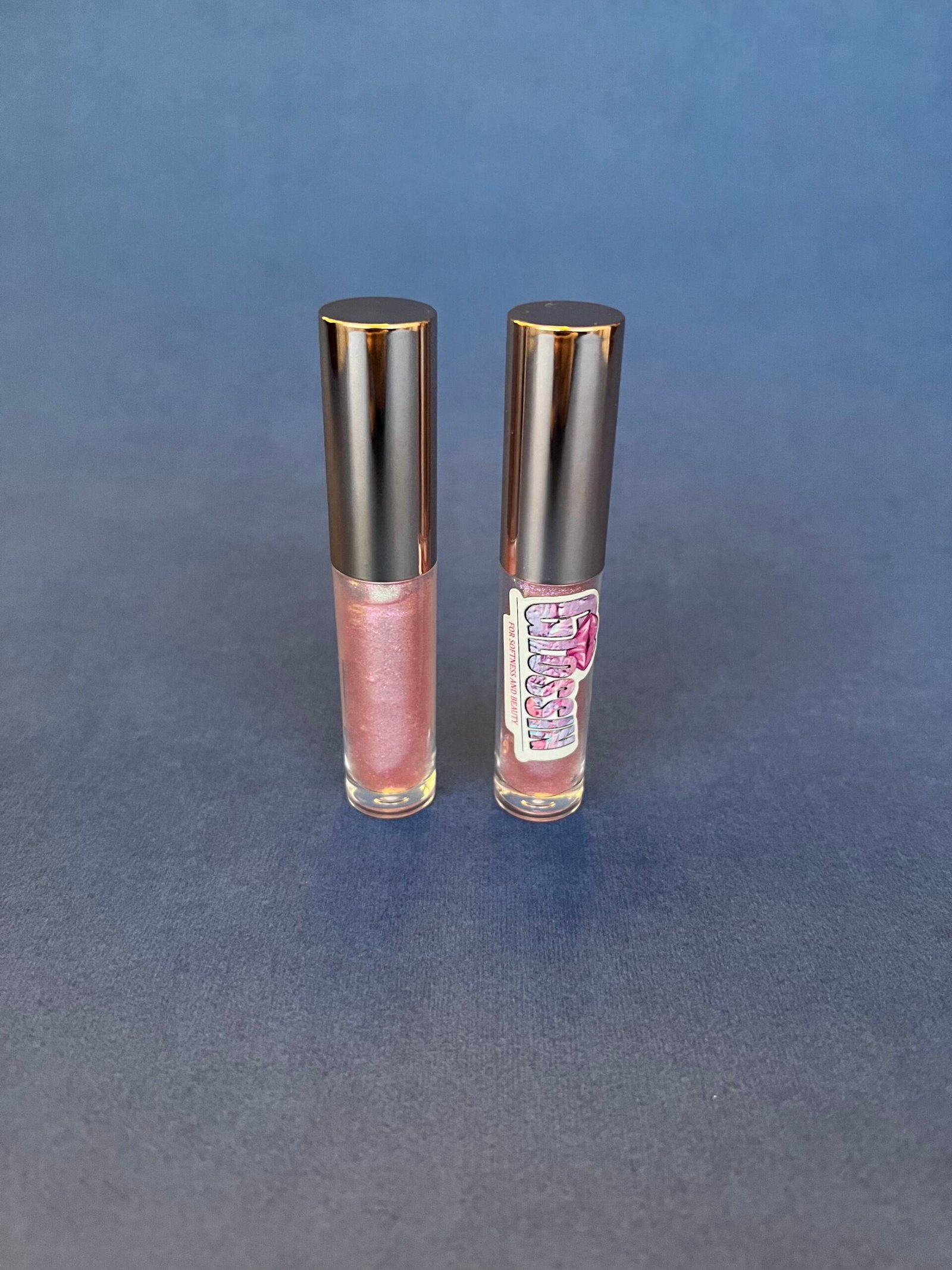 Pink shimmer lip gloss, clear with a soft pink sparkle, non-sticky, highly moisturizing with a pleasant scent, enriched with oils and vitamins