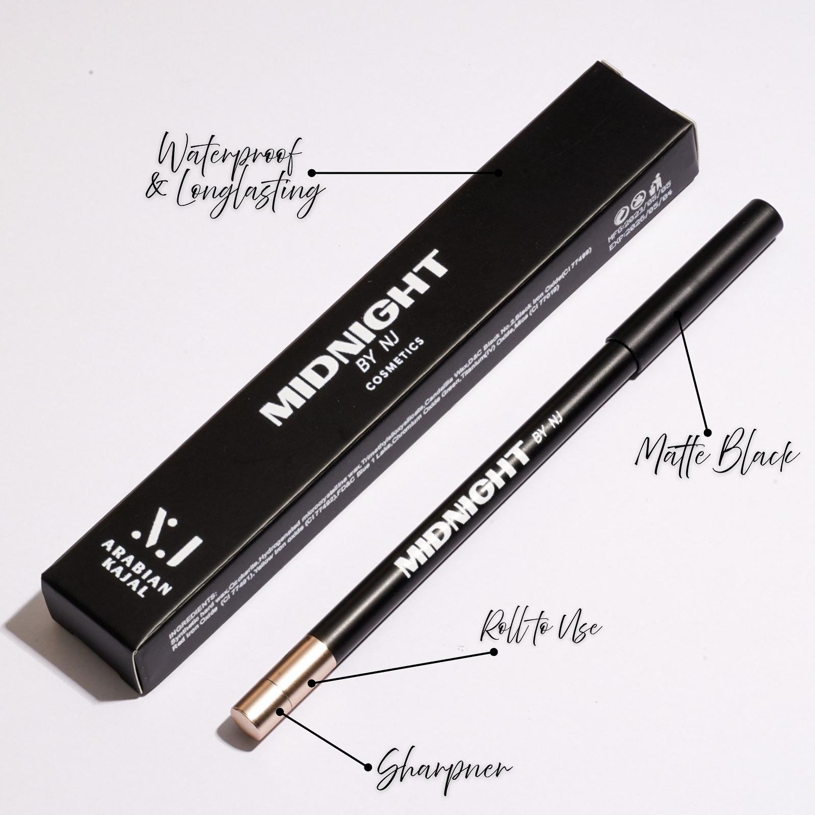 أطلقي قوة عيونك مع MIDNIGHT من NJ – قلم الكحل العربي المميز، المصمّم لكل من تجرؤ على تحديد نظرتها بجرأة.