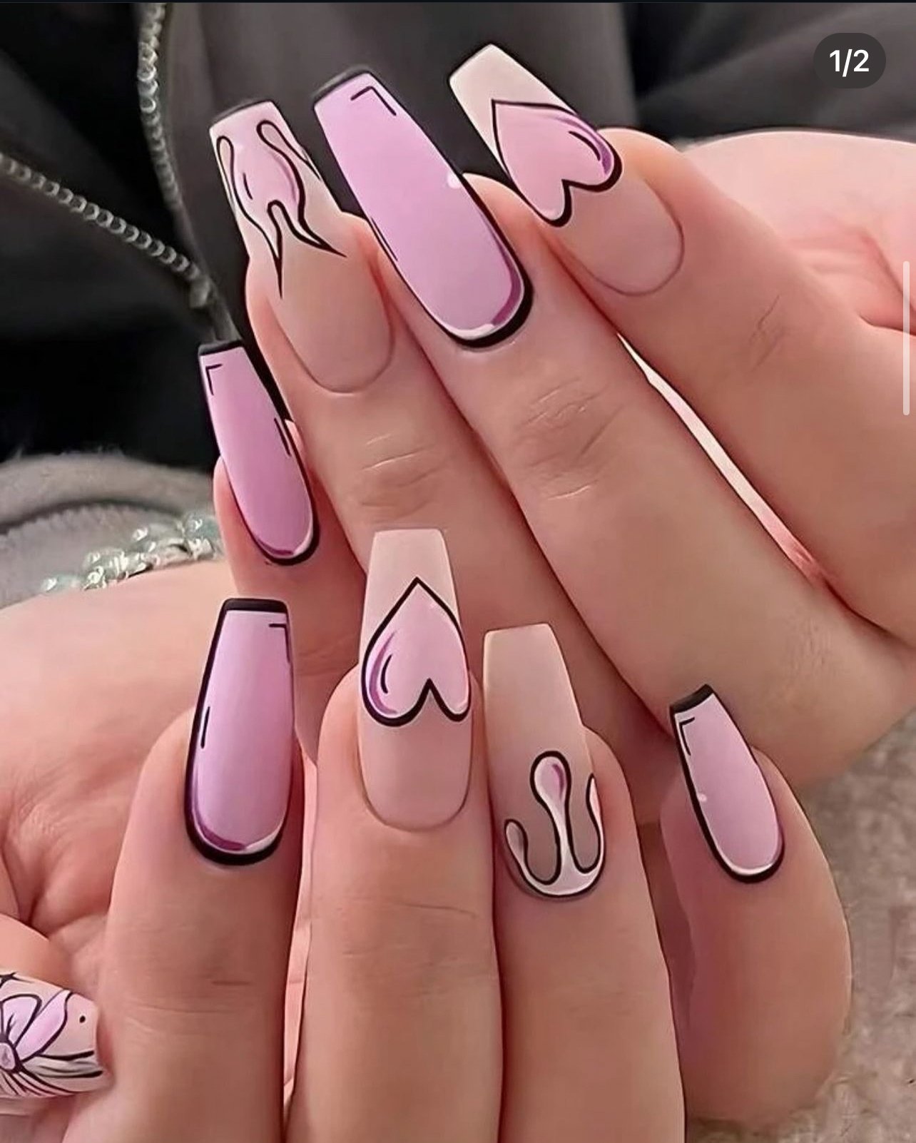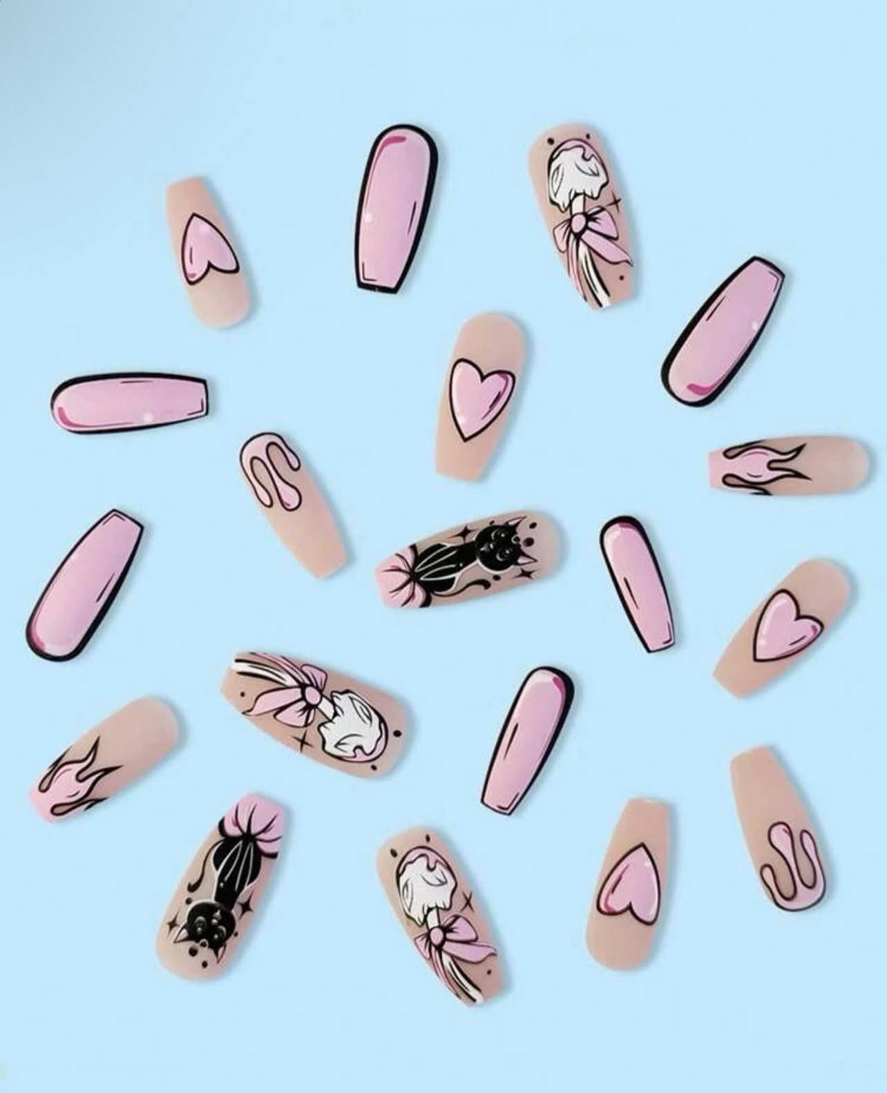 12pcs Long Coffin Comic Heart Pattern nail & 1sheet Tape & 1pc Nail File Press On Nails Nail Supplies