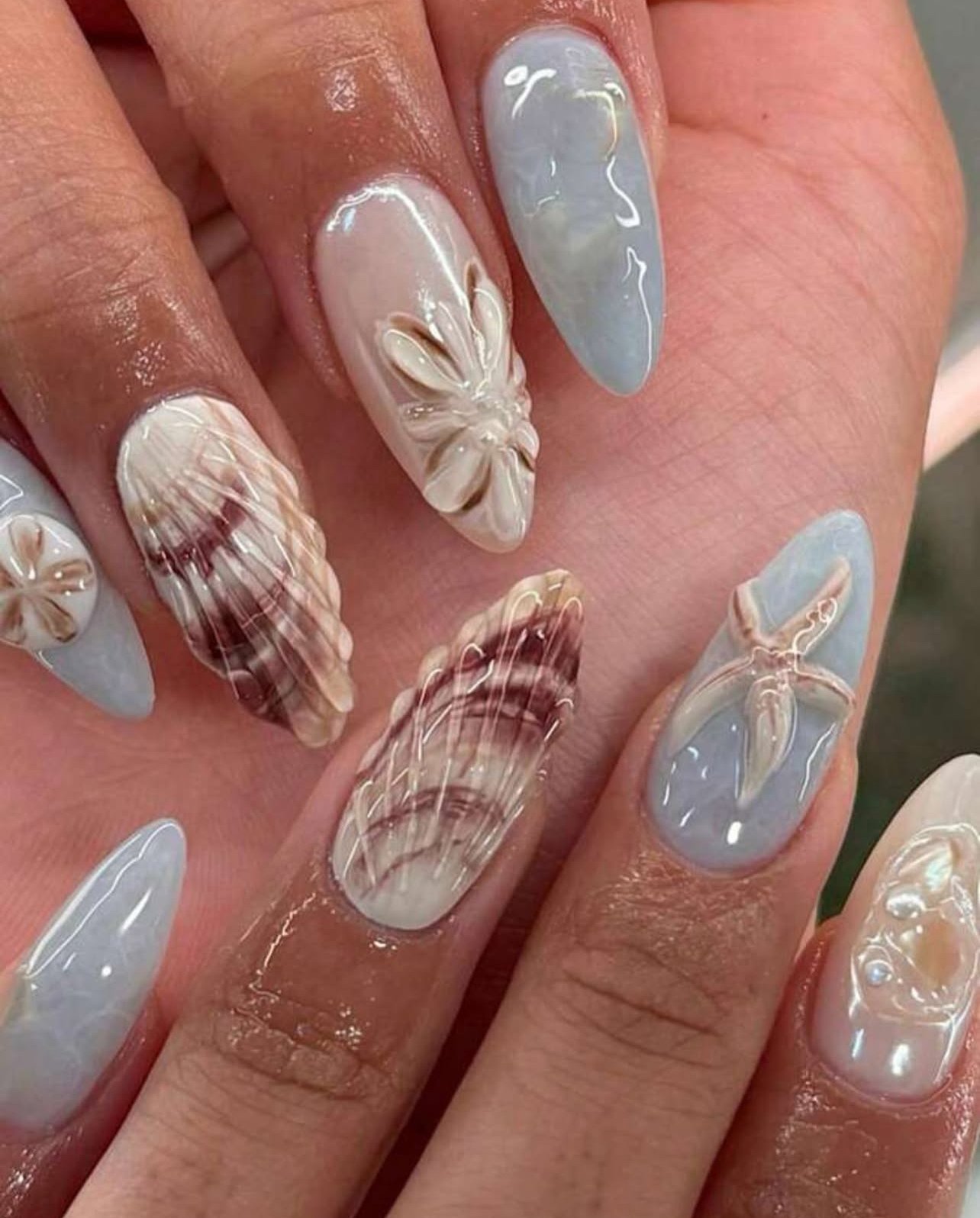 Instantly Upgrade Your Look With 12pcs Almond Square Press On Nails Set Summer Ocean Style Fresh Design Ocean Stripes Nails Cute Shell Pattern 3D Striped Nails Elegant Green Starfish